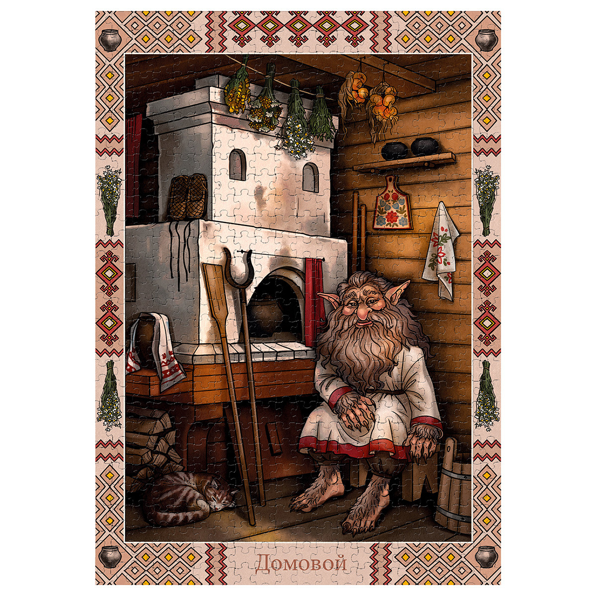 Пазлы ТМ Фрея - это яркие, интересные, увлекательные дизайны. Специально для вас мы разработали уникальную серию картин " Славянская мифология". Готовый пазл с таким сюжетом может стать интересным и необычным украшением интерьера. Также пазлы ТМ Фрея будут отличным подарком для ваших близких. Детали пазлов этой серии толще обычных. Для изготовления деталей мы используем европейский картон премиум качества. Такой картон не деформируется и не расслаивается даже при многократной сборке пазла. Размер готовой работы может отличаться от указанной на сайте. Актуальная информация размещена на упаковке товара. Домового обычно представляли в облике хозяина дома или предка семьи, но с некоторыми зверинымичертами, такими как большие торчком стоящие уши, лохматость и косматость, шерсть по всему телуи длинные когти. Одет домовой в кафтан и рубаху, подпоясанную кушаком. Домовой может жить в красном углу, на печи, у порога, на голбце, на чердаке, в углу клети или в подполе. Место, выбранное домовым, нельзя занимать – это может привести к неприятностям. По одним поверьямдомовой в доме один, по другим – состав его семьи совпадает с составом семьи хозяина дома. Домовой охраняет благополучие в семье, сторожит хозяйство, поддерживает огонь в печи, убирает дом, сушит зерно, ходит за водой, ухаживает за скотом. Но рассерженный домовой проказничает: прячет вещи, шумит ночами в подполе или на чердаке, бьет посуду, стягивает со спящего одеяло, съедает оставленныепродукты, путает оставленную пряжу. При переезде обязательно приглашали домового из старого домав новое место: переносили горящие угли из старой печи в новую или вешали накануне в избе лапоть, а потомтащили всю дорогу в новый дом лапоть на веревочке, веря, что на нем едет домовой. Сообщить о неточности в описании